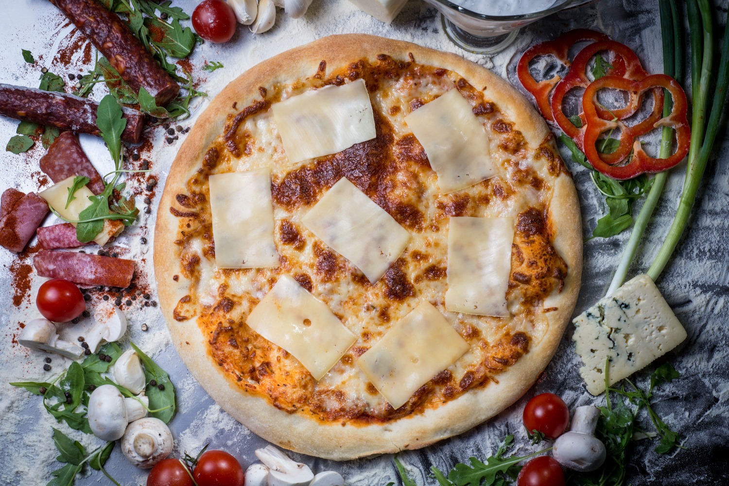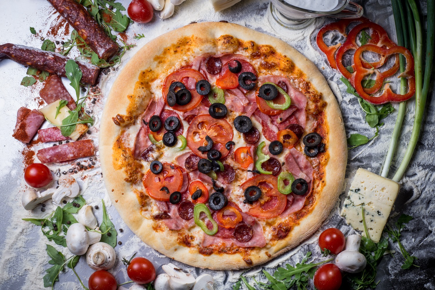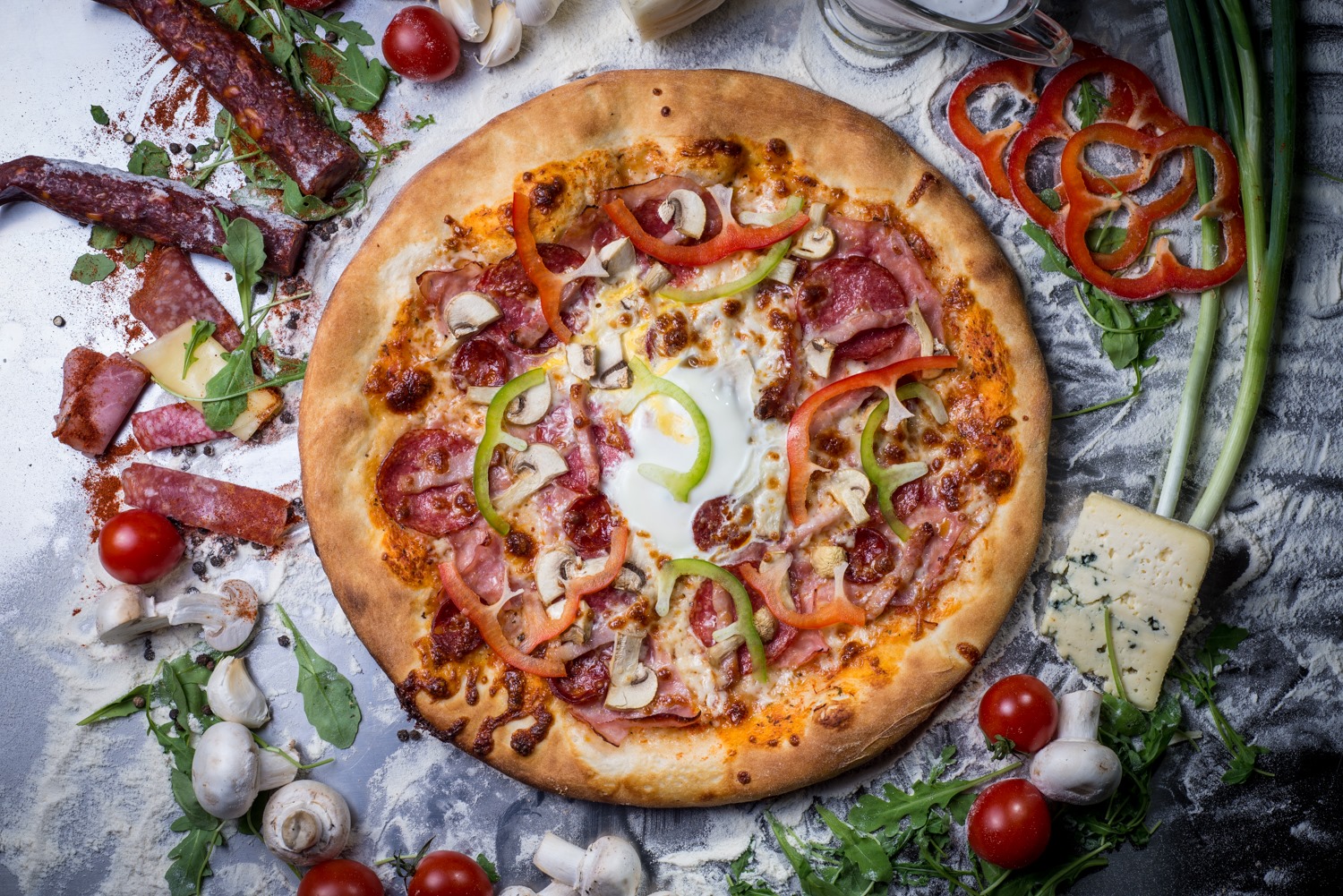 Pizza Bănățeană (600g)Sos roșii, mozzarella, șuncă, salam, bacon, cârnați, ardei, roșii, măsline, condimente (oregano)