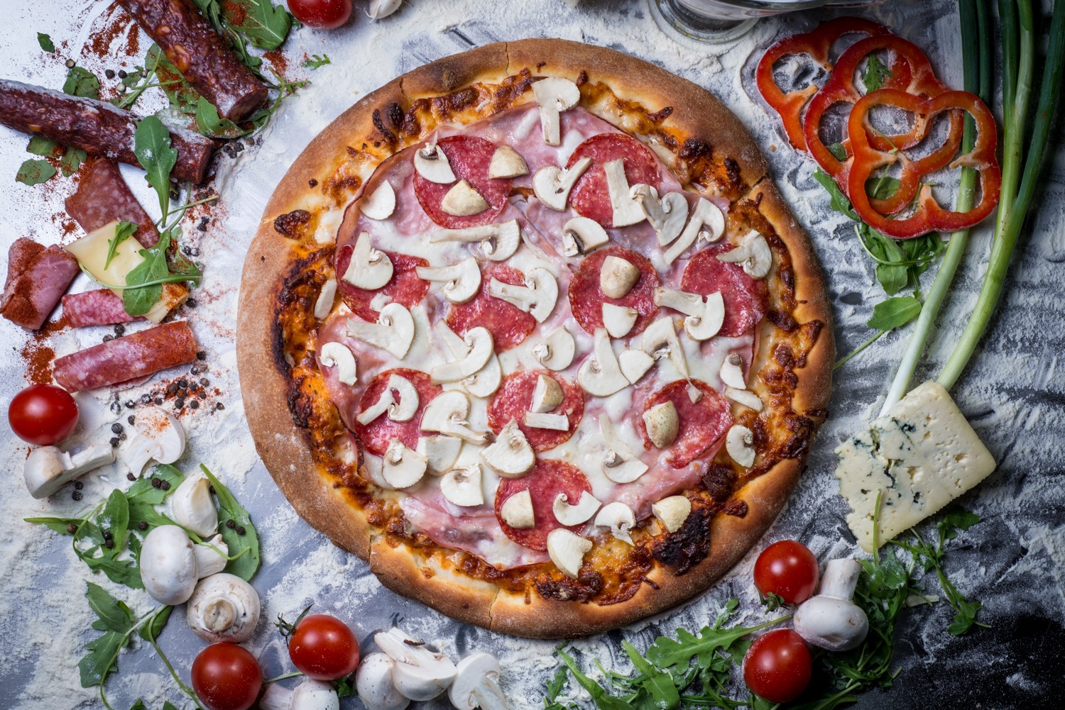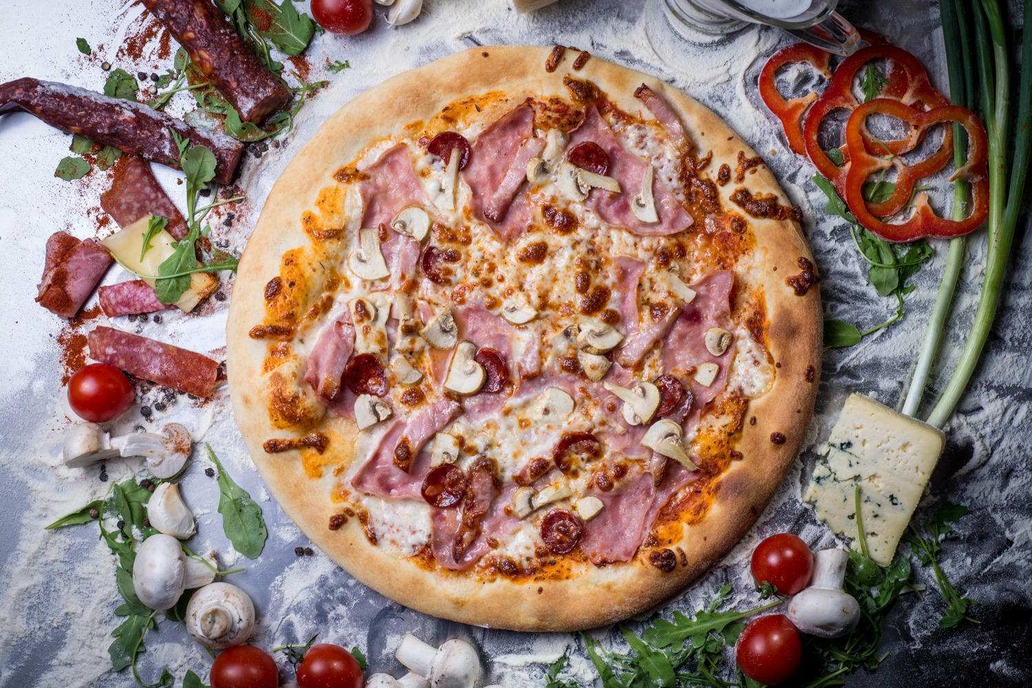 Pizza Ardelenească (600g)Sos roșii, mozzarella, șuncă, bacon, cârnați, ciuperci, condimente (oregano)
