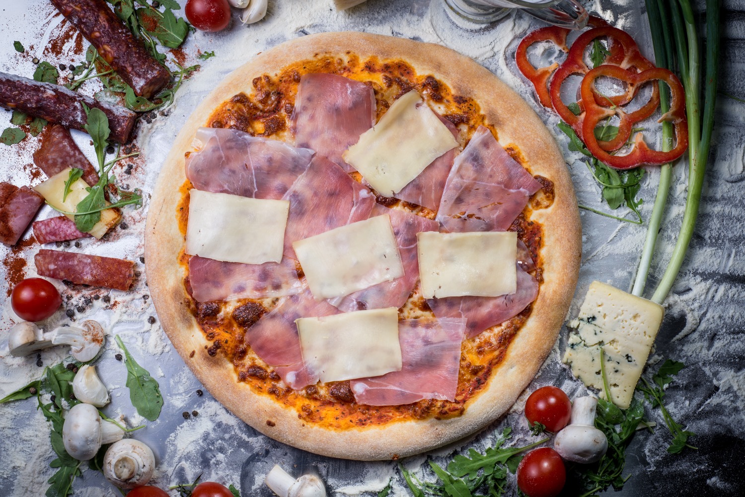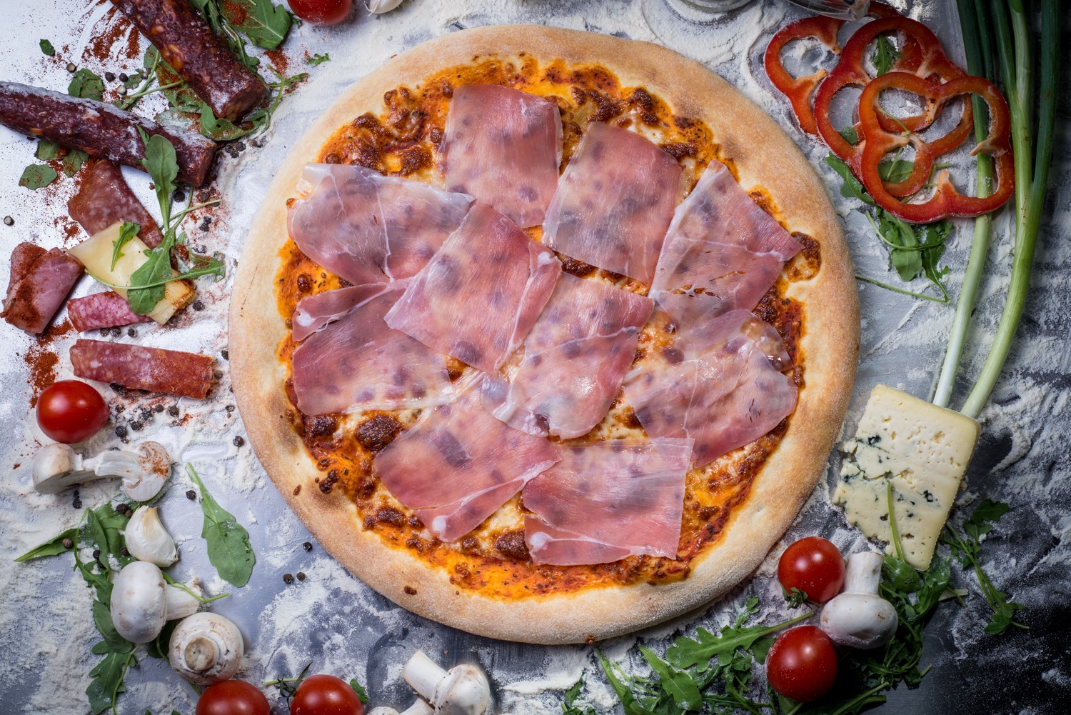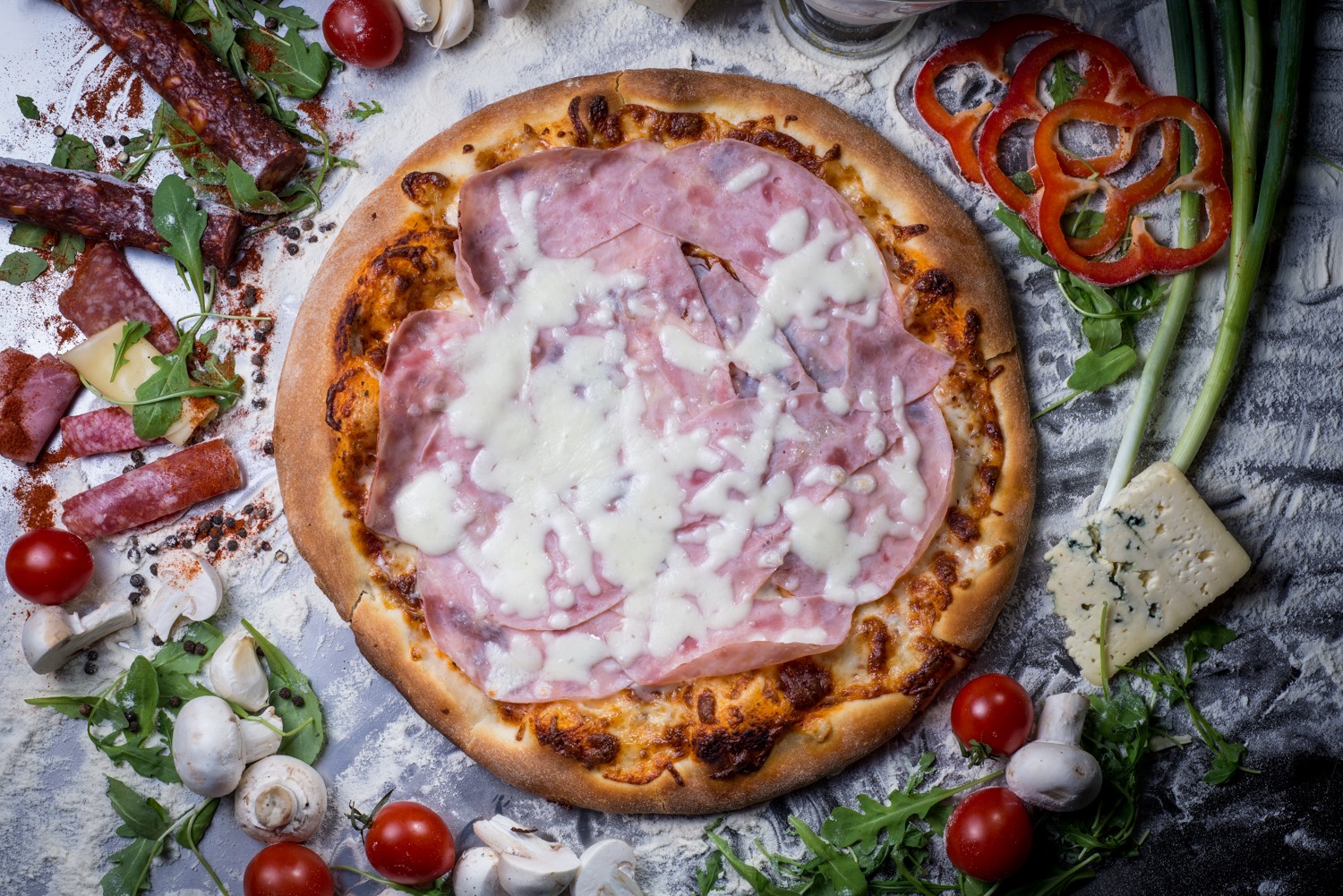 Pizza Prosciutto (500g)Sos roșii, mozzarella, șuncă, condimente (oregano)