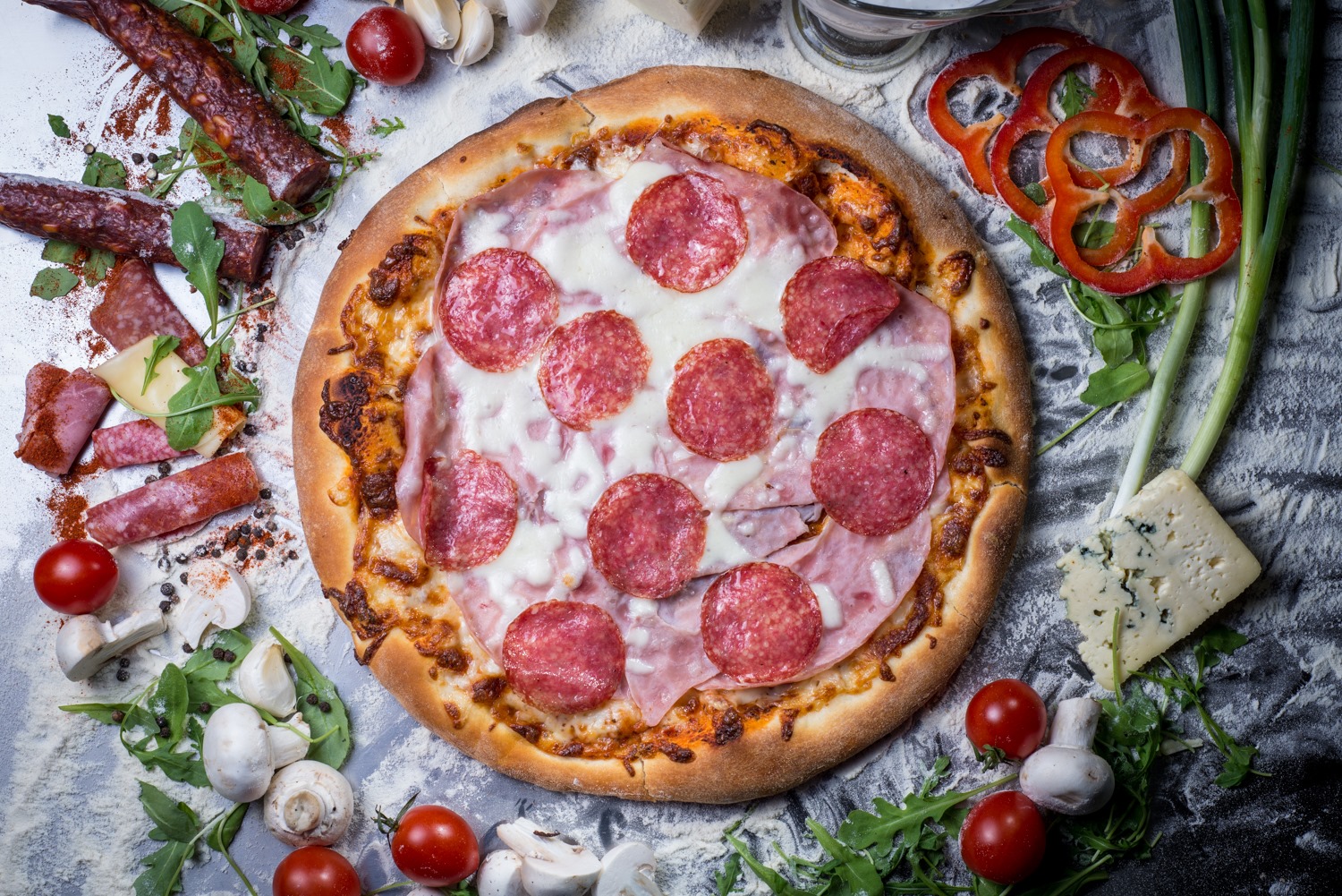 Pizza Prosciutto Salami (500g)Sos roșii, mozzarella, șuncă, salam, condimente (oregano)
