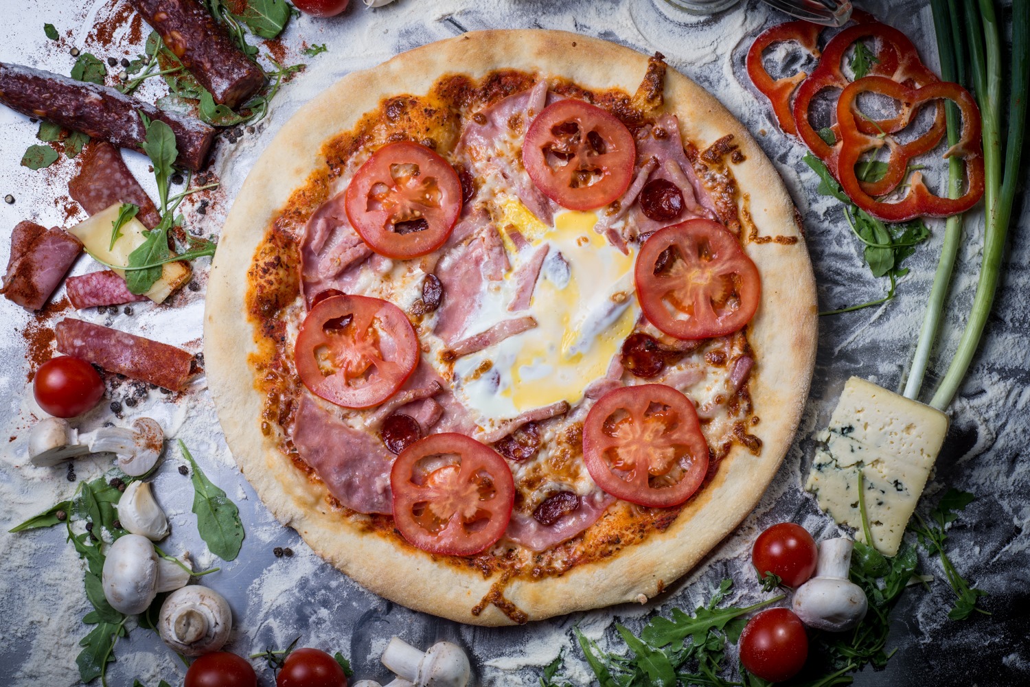 Pizza Țigănească (600g)Sos roșii, mozzarella, șuncă, salam, bacon, cârnați, ou, roșii, condimente (oregano)